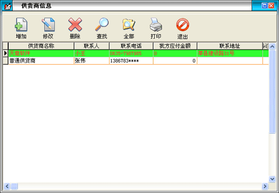 在基本設(shè)置模塊中點(diǎn)擊“供貨商信息”按鈕打開供貨商信息窗口。在窗口中可以看到所有的供貨商。點(diǎn)擊“增加”按鈕打開增加供貨商窗口,輸入供貨商的信息,供貨商名稱不能重復(fù)。如果該供貨商有期初金額就在“期初應(yīng)收”后輸入相應(yīng)的金額。點(diǎn)擊“修改”按鈕可以修改選中的供貨商信息。點(diǎn)擊“刪除”按鈕可以刪除選中的供貨商,如果該供貨商有業(yè)務(wù)發(fā)生則不能刪除。系統(tǒng)有一個(gè)“普通供貨商”是不能被刪除的。點(diǎn)擊“查找”按鈕打開供貨商查詢窗口,輸入相應(yīng)的條件查詢不同的供貨商信息。點(diǎn)擊“全部”按鈕可以列出所有的供貨商信息。 |