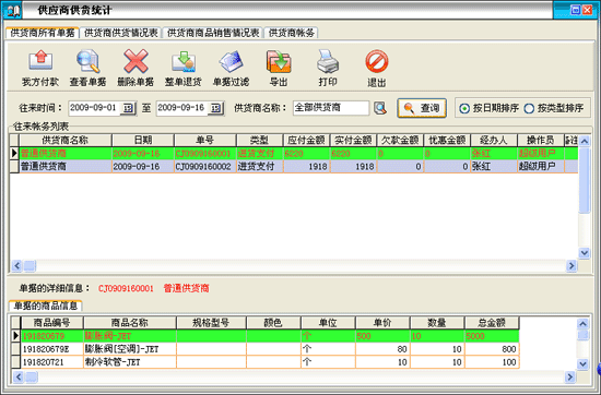 在往來帳務(wù)窗口中共分為三部分:供貨商所有單據(jù)、供貨商商品銷售情況、供貨商帳務(wù)。 |