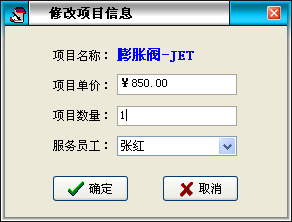 在‘增加維修信息’窗口中,輸入項(xiàng)目單價(jià)和數(shù)量,以及該配件的銷售員工或服務(wù)的服務(wù)員工!