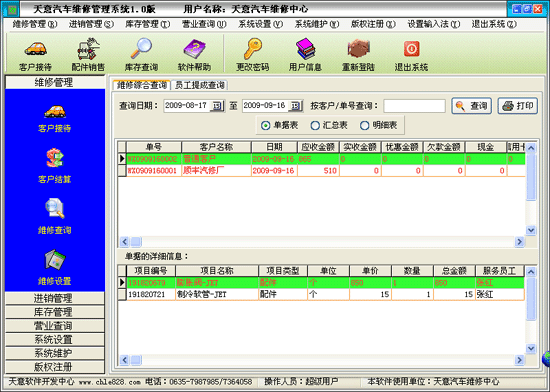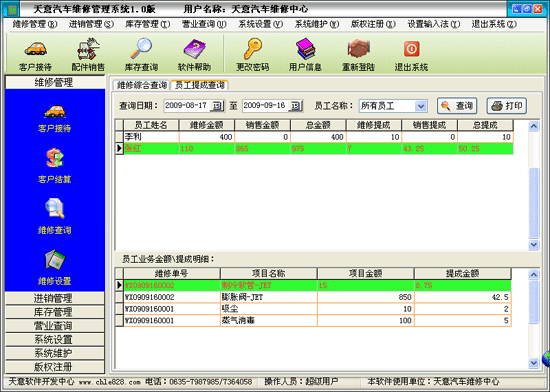 單據(jù)表按單據(jù)號(hào)顯示維修業(yè)務(wù),分個(gè)單據(jù)對(duì)應(yīng)相應(yīng)的詳細(xì)項(xiàng)目列表; 員工提成查詢:顯示各員工的維修和銷售提成情況;如圖所示: