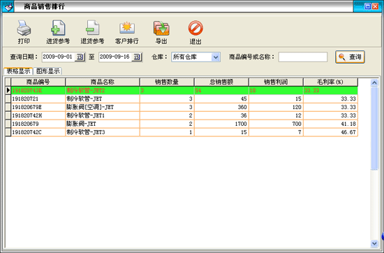 | 在統(tǒng)計(jì)報(bào)表中點(diǎn)擊'商品銷售排行'按鈕,打開商品銷售排行窗口: