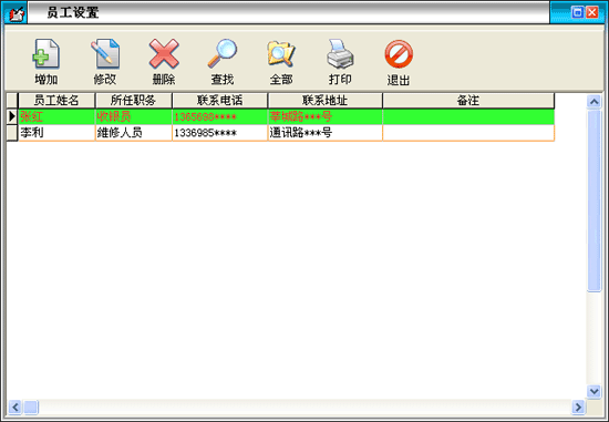 在基本設(shè)置模塊中點(diǎn)擊“員工信息”按鈕打開員工信息窗口。在窗口中可以看到所有的員工。點(diǎn)擊“增加”按鈕打開增加員工窗口,輸入員工的信息,員工名稱不能重復(fù)。點(diǎn)擊“修改”按鈕可以修改選中的員工信息。點(diǎn)擊“刪除”按鈕可以刪除選中的員工。點(diǎn)擊“查找”按鈕打開員工查詢窗口,輸入相應(yīng)的條件查詢不同的員工信息。點(diǎn)擊“全部”按鈕可以列出所有的員工信息。 |