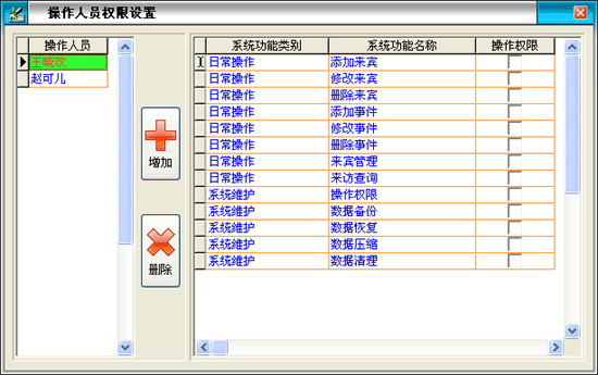 添加操作人員,請(qǐng)點(diǎn)擊“增加”按鈕,錄入操作人員名稱和操作密碼,注意操作人員名稱不能相同。刪除某操作人員,請(qǐng)選中該人員點(diǎn)擊“刪除”按鈕。 |