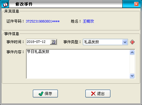 在該界面可以添加備注信息,修改完成來(lái)賓信息后,直接點(diǎn)擊“保存”按鈕退出即可。 |
