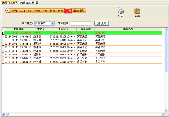 選擇事件類型、輸入來(lái)賓姓名,點(diǎn)擊時(shí)間段或右鍵選擇指定的菜單項(xiàng)進(jìn)行查詢,點(diǎn)擊“打印”,打印來(lái)訪信息記錄,點(diǎn)擊“導(dǎo)出”按鈕,導(dǎo)出來(lái)訪記錄到Excel文件中。 |