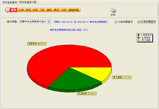 可以根據(jù)不同的統(tǒng)計(jì)類型,如按月統(tǒng)計(jì)、按日統(tǒng)計(jì)、按事件發(fā)生頻度排行統(tǒng)計(jì)賓客來(lái)訪記錄,并以柱狀圖或曲線圖的方式顯示。