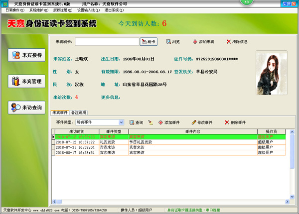 天意身份證讀卡簽到系統(tǒng)是一款功能專業(yè)、操作簡(jiǎn)單的身份證讀卡簽到管理軟件,軟件功能包括來(lái)賓刷卡登記、來(lái)訪事件記錄、來(lái)賓信息查詢、來(lái)訪信息查詢統(tǒng)計(jì)等模塊。使用場(chǎng)景如員工簽到、客戶來(lái)訪、禮品的發(fā)放、臨時(shí)會(huì)議來(lái)訪登記等。軟件界面非常簡(jiǎn)單、美觀、功能完善,人性化的軟件流程,普通用戶無(wú)需培訓(xùn)也能立即上手使用,降低使用成本,天意身份證讀卡簽到系統(tǒng)是適合客戶來(lái)訪登記信息化管理的工具。 |