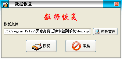 系統(tǒng)默認(rèn)備份路徑是當(dāng)前文件夾下的backup,如恢復(fù)其它路徑中的備份文件,可點(diǎn)擊“選擇文件”按鈕來(lái)更改恢復(fù)路徑,點(diǎn)擊“恢復(fù)”按鈕進(jìn)行數(shù)據(jù)恢復(fù)。 |