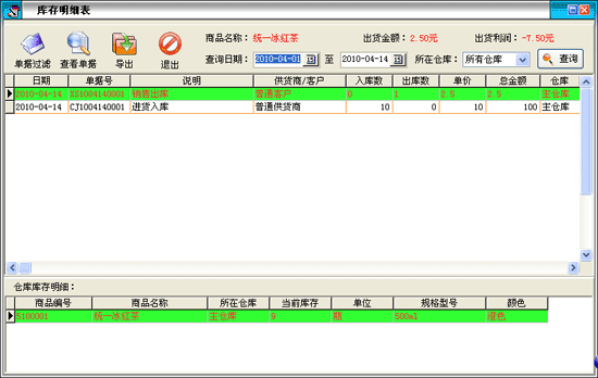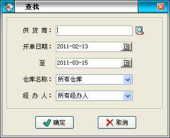 用戶可以通過'查找'按鈕,對不同的供貨商、倉庫、業(yè)務員、單據(jù)類型,進行分類統(tǒng)計,