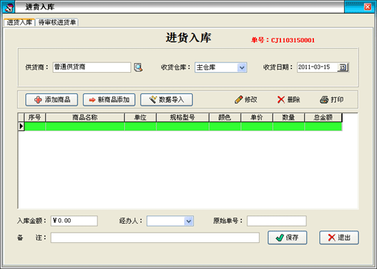 在進貨管理中點擊“進貨入庫”按鈕打開進貨窗口: