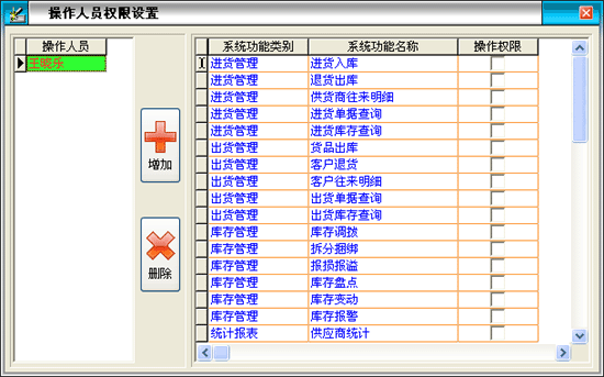 ·進入“操作人員權限設置”窗口中,如需增加操作人員,請點擊“增加”按鈕,錄入操作人員名稱和操作密碼,注意操作人員名稱不能相同。
