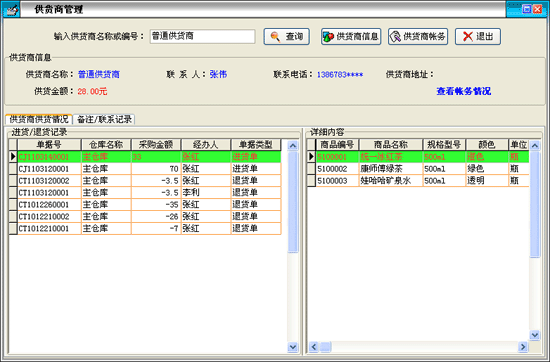 供貨商供貨情況:以表格形式在'進貨/退貨記錄'欄內顯示我方與當前供貨商發(fā)生的貨品入庫、退貨記錄,在'詳細內容'欄內顯示相應'進貨'或'退貨'記錄所對應的詳細 貨品信息;
