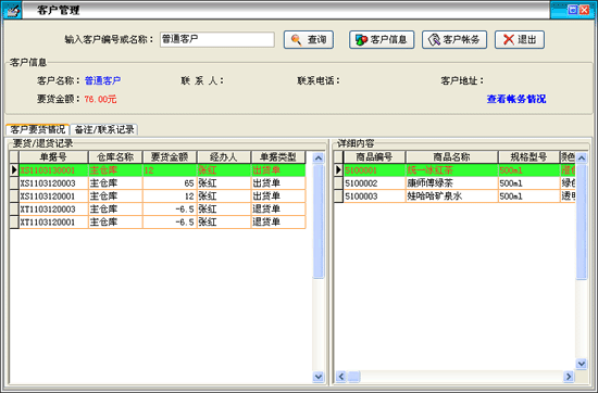 客戶出貨情況:以表格形式在'出貨/退貨記錄'欄內顯示我方與當前客戶發(fā)生的貨品出庫、客戶退貨記錄,在'詳細內容'欄內顯示相應'出貨'或'退貨'記錄所對應的詳細 貨品信息;