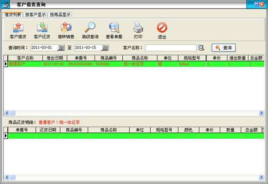 用戶通過在'借貨表格'中單擊選擇不同的借貨記錄,此時'還貨表格'中將顯示借貨商品的還貨記錄。