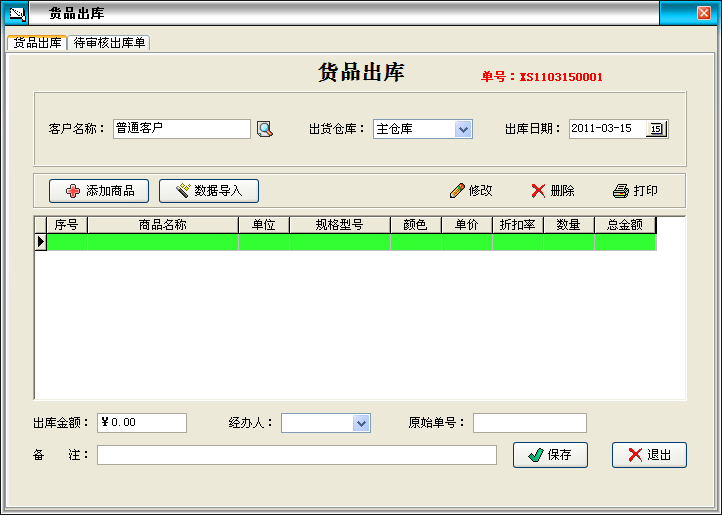 點擊出庫管理的“貨品出庫”按鈕打開貨品出庫窗口: