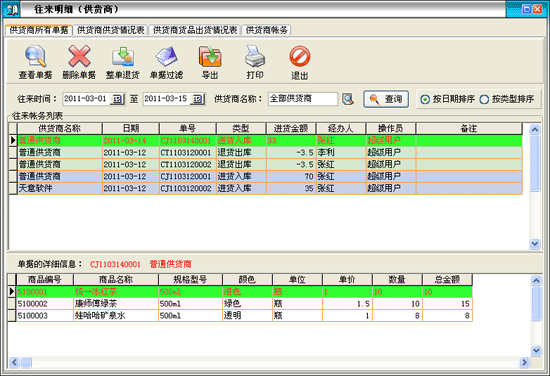 通過'供貨商帳務'按鈕,跳轉到'往來帳務(供貨商)'窗口,并默認以當前供貨商作為查詢條件進行各項查詢。