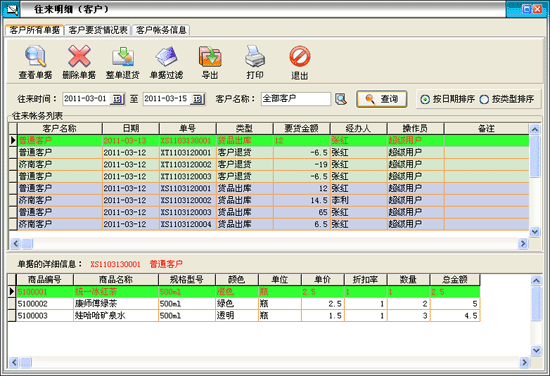 點擊出貨管理中的“往來明細”按鈕打開窗口: