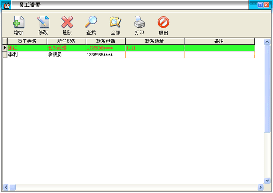 在基本設置模塊中點擊“員工信息”按鈕打開員工信息窗口。在窗口中可以看到所有的員工。點擊“增加”按鈕打開增加員工窗口,輸入員工的信息,員工名稱不能重復。點擊“修改”按鈕可以修改選中的員工信息。點擊“刪除”按鈕可以刪除選中的員工。點擊“查找”按鈕打開員工查詢窗口,輸入相應的條件查詢不同的員工信息。點擊“全部”按鈕可以列出所有的員工信息。