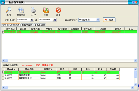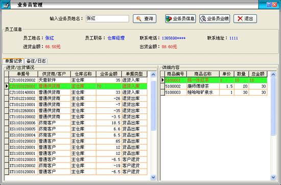 業(yè)務員業(yè)績情況:在'單據(jù)記錄'欄內顯示該業(yè)務員經(jīng)辦的進貨入庫、退貨出庫、貨品出庫、客戶退庫情況,在'詳細內容'欄內顯示相應'進貨'或'出貨'等記錄所對應的詳細 貨品信息;