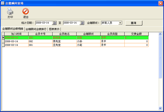 | 在該窗口中可以查詢出所有會(huì)籍顧問的業(yè)績情況,共分為三個(gè)部分:會(huì)籍顧問業(yè)績明細(xì)、會(huì)籍顧問業(yè)績排行、圖表顯示。 |