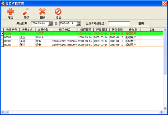 | 在會(huì)員管理中點(diǎn)擊“會(huì)員請假”進(jìn)入會(huì)員請假界面如圖: | |||