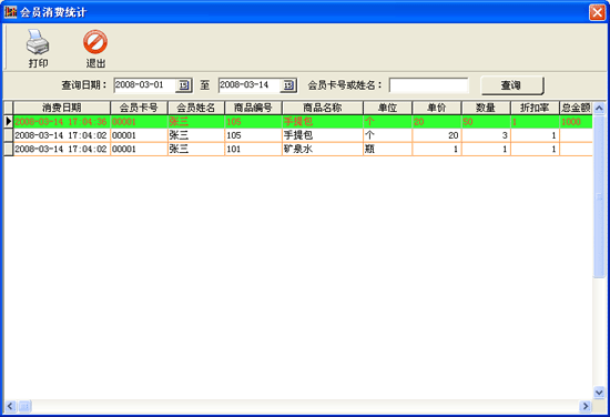 | 在該窗口中可以根據(jù)查詢?nèi)掌诤蜁?huì)員編號或名稱查詢出會(huì)員消費(fèi)商品的記錄,并且可以點(diǎn)擊“打印”對查詢出的記錄打印。 |