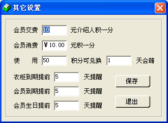 | 對本軟件一些基本信息的設(shè)置,包括有:會(huì)員類型設(shè)置、衣柜設(shè)置、員工設(shè)置、其它設(shè)置。 | |||