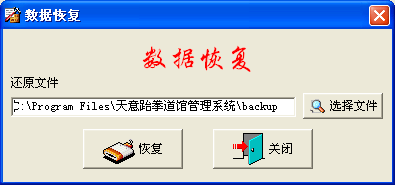 | 系統(tǒng)默認(rèn)備份路徑是當(dāng)前文件夾下的backup,如恢復(fù)其它路徑中的備份文件,可點(diǎn)擊“選擇文件”按鈕來更改恢復(fù)路徑,點(diǎn)擊“恢復(fù)”按鈕進(jìn)行數(shù)據(jù)恢復(fù)。 |