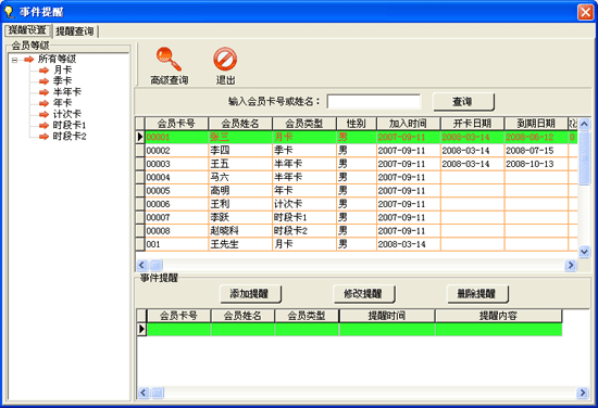 | 在會(huì)員管理中點(diǎn)擊“事件提醒”進(jìn)入事件提醒界面如圖: | |||