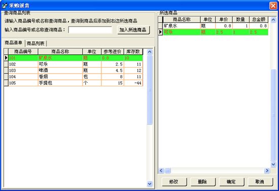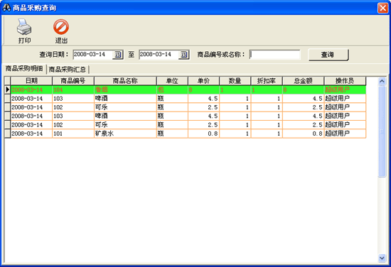 | 在該窗口中會(huì)顯示出所有商品的商品采購明細(xì)和匯總情況,用戶可以根據(jù)查詢?nèi)掌、商品編號或名稱來過濾不同的采購信息。 |