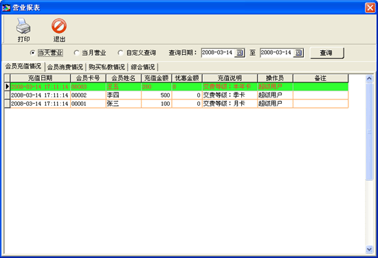 | 在營業(yè)報(bào)表窗口中主要分會(huì)員充值情況、會(huì)員消費(fèi)情況、購買私教情況、綜合情況。用戶可以選擇當(dāng)天、當(dāng)月、自定義來查詢出不同的記錄。 |