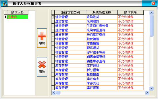 ·進(jìn)入“操作人員權(quán)限設(shè)置”窗口中,如需增加操作人員,請點擊“增加”按鈕,錄入操作人員名稱和操作密碼,注意操作人員名稱不能相同。