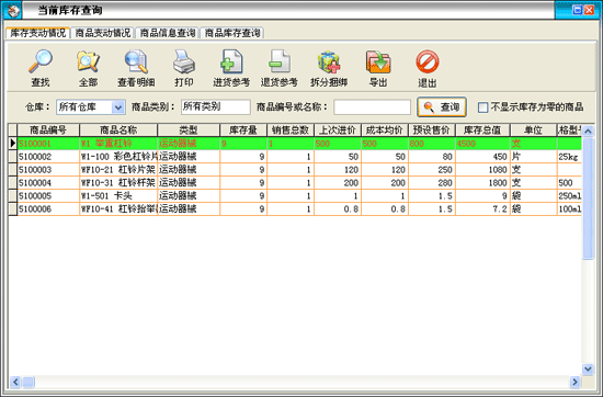 在進(jìn)貨管理中點擊“當(dāng)前庫存查詢”按鈕打開庫存查詢窗口: