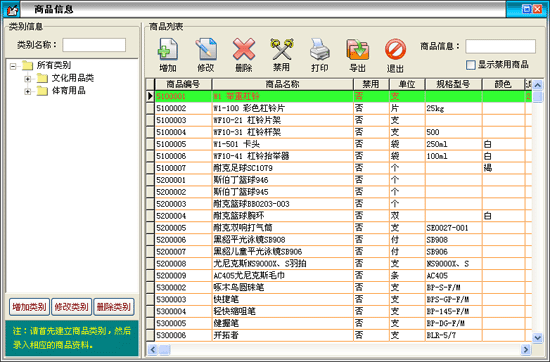 在商品信息窗口中左邊是商品類別,右邊列表中是該類別對應(yīng)的商品。可以新增類別,重命名和刪除類別。新增的類別是屬于所選類別的下一級,如果類別下有商品存在則該類別是不能被刪除的。在類別名稱后的文本框中可以輸入類別名稱或類別簡碼來查詢需要的類別。