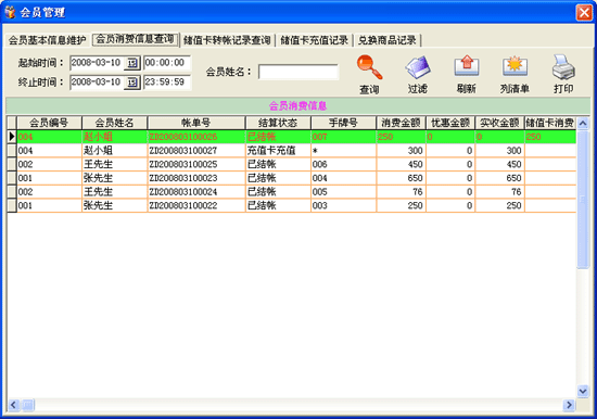 用于查詢本店登記在冊會員的所有消費記錄,并可列出每次消費記錄的詳細(xì)消費信息。