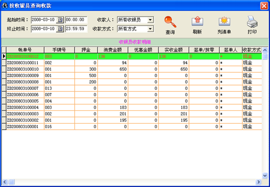 | ·點擊菜單“營業(yè)查詢→收銀明細(xì)查詢”進(jìn)入“收銀明細(xì)查詢”界面。 ·進(jìn)入“收銀明細(xì)查詢”窗口后,系統(tǒng)默認(rèn)顯示在數(shù)據(jù)表中的收款明細(xì)為當(dāng)前操作員從當(dāng)天的收款明細(xì)。可以在時間范圍中指定特定的時間并選擇收銀員后點擊查詢按鈕,數(shù)據(jù)表中將顯示符合條件的收銀明細(xì)。 ·點擊“刷新”按鈕,數(shù)據(jù)表將顯示所有收員的收款明細(xì)。 ·點擊打印按鈕可將數(shù)據(jù)表中的數(shù)據(jù)打印到已連接并能正常工作的打印機(jī)上。 |