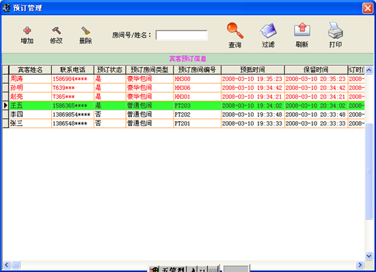 此項功能可以完成增加預(yù)訂、修改預(yù)訂、刪除預(yù)訂,預(yù)訂情況的查詢、打印等功能。