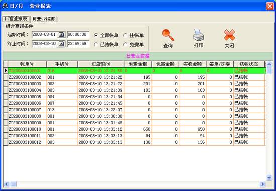 ·點擊菜單“營業(yè)查詢→營業(yè)情況報表”,營業(yè)情況報表可分為日營業(yè)報表和月營業(yè)報表,可根據(jù)需要點擊“營業(yè)情況報表”的下級菜單“日營業(yè)報表”或“月營業(yè)報表”。 ·在隨即彈出的窗口中選擇打印的條件(包括:全部:表示所有已離店的賓客,包括掛單;已結(jié)賬:表示所有已離店并已結(jié)清消費款項的賓客;掛單:表示所有已離店但并未結(jié)賬的賓客;免費:表示所有已離店并不收取蚌客的任何費用)點擊確定后彈出打印預(yù)覽窗口,點擊“打印” 按鈕可將打印預(yù)覽窗口中的數(shù)據(jù)打印到已連接并能正常工作的打印機(jī)上。 |