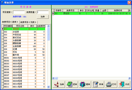 ·選定有消費需求的賓客手牌后雙擊此手牌或點擊菜單“點單消費→增加消費”,(或點擊主窗口中的“增加消費”快捷按鈕)進(jìn)入增加消費界面。 ·進(jìn)入“增加消費”后,在窗口的左半部“項目消單”中選擇賓客所要消費的項目(可通過輸入消費項目的編號或簡拼進(jìn)行查詢),在消費數(shù)量中填寫所需消費的數(shù)量后點擊“增加”按鈕,就把所選的消費項目添加到窗口右半部的“消費清單”中。(注:如果賓客所消費的項目需要服務(wù)生提供服務(wù),點擊“增加”按鈕后還會彈出一個選擇服務(wù)生的窗口,選擇可提供服務(wù)的服務(wù)生點擊“確定”即可。) ·如果要刪除一個已增加的消費項目,可在窗口右半部的“消費清單”中選中要刪除的項目后點擊“刪除”按鈕即可。 ·增加消費完成之后點擊“保存”按鈕將此次操作保存到此賓客的消費明細(xì)賬中并退出此窗口,如果不想保存可直接點擊窗口右上角的“X”按鈕退出“增加消費”窗口。 |