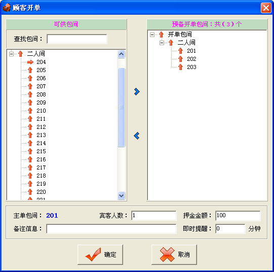 ·在選定某一處于“可供”狀態(tài)的包間后,通過點(diǎn)擊菜單“來賓登記→顧客開單”(或直接點(diǎn)擊主窗口中的“顧客開單” 快捷按鈕)菜單進(jìn)入顧客開單界面。 ·進(jìn)入“顧客開單”界面后,可以看到各個(gè)包間的可供包間和相關(guān)費(fèi)用。 ·填寫押金金額(根椐本店情況而定)。 ·填寫完之后,點(diǎn)擊 “確定” 按鈕將完成開單任務(wù),點(diǎn)擊“取消”按鈕將取消此次開單操作。 |