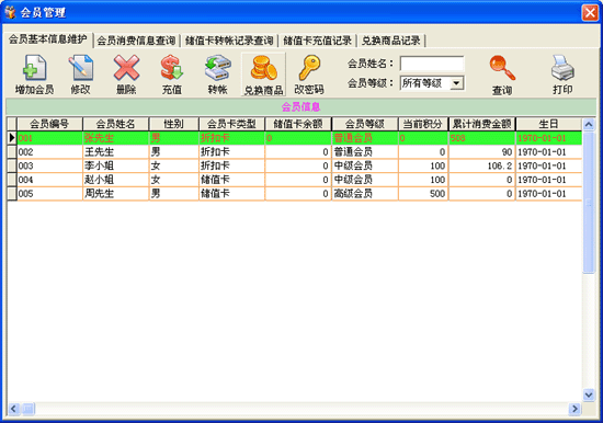 | ·點(diǎn)擊主窗口中的快捷按鈕“會(huì)員管理”進(jìn)入會(huì)員“基本信息管理”界面。 ·增加會(huì)員:點(diǎn)擊本窗口中點(diǎn)擊“增加”按鈕即彈出增加會(huì)員窗口,在此窗口中輸入會(huì)員的基本信息后點(diǎn)擊“確定”按鈕后完成一次增加任務(wù)并返回“基本信息管理”窗口,(注:增加會(huì)員窗口中的會(huì)員等級(jí)只能隨著會(huì)員積分的改變而改變,會(huì)員的初始積分可在“系統(tǒng)設(shè)置中”設(shè)置。) ·修改會(huì)員信息:在本窗口的數(shù)據(jù)表中選擇要修改的會(huì)員信息(可通過查詢的方式找到要修改的會(huì)員信息)后點(diǎn)擊“修改”按鈕即彈出修改會(huì)員信息窗口,操作方法同增加會(huì)員。 ·刪除會(huì)員:在本窗口的數(shù)據(jù)表中選擇要?jiǎng)h除的會(huì)員(可通過查詢的方式找到要修改的會(huì)員信息)后點(diǎn)擊“刪除”按鈕,彈出一提示窗口,“刪除后將不能恢復(fù),確定要?jiǎng)h除嗎?”,點(diǎn)擊“是”執(zhí)行刪除,點(diǎn)擊“否”則不做刪除操作。 ·對(duì)本窗口數(shù)據(jù)表中的數(shù)據(jù)可進(jìn)行打印操作。 |