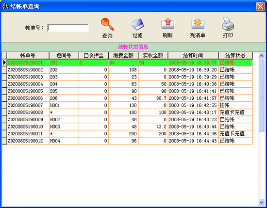 | ·點(diǎn)擊菜單“營(yíng)業(yè)查詢→結(jié)賬狀態(tài)查詢”進(jìn)入結(jié)賬狀態(tài)查詢界面。 ·在“賬單號(hào)“后的文本框中輸入賬單號(hào)后,點(diǎn)擊查詢按鈕在本窗口的數(shù)據(jù)表中將顯示對(duì)應(yīng)賬單的消費(fèi)信息,點(diǎn)擊“列清單”可把當(dāng)前選定賬單的消費(fèi)清單顯示在打印預(yù)覽窗口中。 ·點(diǎn)擊“刷新”按鈕,數(shù)據(jù)表將顯示所有已離店賓客的結(jié)賬狀態(tài)。 ·點(diǎn)擊“打印”按鈕,可將當(dāng)前數(shù)據(jù)表中顯示的數(shù)據(jù)打印輸出到已連接并能正常工作的打印機(jī)上。 |