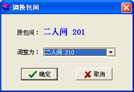 | ·在選定需要更換的包間后, 通過點(diǎn)擊菜單“來賓登記→更換包間”進(jìn)入更換包間界面。 ·進(jìn)入“更換包間”界面后可以看到當(dāng)前待調(diào)換的包間號(hào)(即:原包間),在“調(diào)整為”后的下拉框中選擇要調(diào)整到的目標(biāo)包間。 ·選擇之后,點(diǎn)擊“確定”按鈕將完成更換包間任務(wù),點(diǎn)擊“取消”按鈕將取消此次更換包間操作。 |