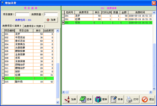 ·選定有消費(fèi)需求的賓客包間后雙擊此包間或點(diǎn)擊菜單“點(diǎn)單消費(fèi)→增加消費(fèi)”,(或點(diǎn)擊主窗口中的“增加消費(fèi)”快捷按鈕)進(jìn)入增加消費(fèi)界面。 ·進(jìn)入“增加消費(fèi)”后,在窗口的左半部“項(xiàng)目消單”中選擇賓客所要消費(fèi)的項(xiàng)目(可通過輸入消費(fèi)項(xiàng)目的編號(hào)或簡(jiǎn)拼進(jìn)行查詢),在消費(fèi)數(shù)量中填寫所需消費(fèi)的數(shù)量后點(diǎn)擊“增加”按鈕,就把所選的消費(fèi)項(xiàng)目添加到窗口右半部的“消費(fèi)清單”中。(注:如果賓客所消費(fèi)的項(xiàng)目需要服務(wù)生提供服務(wù),點(diǎn)擊“增加”按鈕后還會(huì)彈出一個(gè)選擇服務(wù)生的窗口,選擇可提供服務(wù)的服務(wù)生點(diǎn)擊“確定”即可。) ·如果要?jiǎng)h除一個(gè)已增加的消費(fèi)項(xiàng)目,可在窗口右半部的“消費(fèi)清單”中選中要?jiǎng)h除的項(xiàng)目后點(diǎn)擊“刪除”按鈕即可。 ·增加消費(fèi)完成之后點(diǎn)擊“保存”按鈕將此次操作保存到此賓客的消費(fèi)明細(xì)賬中并退出此窗口,如果不想保存可直接點(diǎn)擊窗口右上角的“X”按鈕退出“增加消費(fèi)”窗口。 |