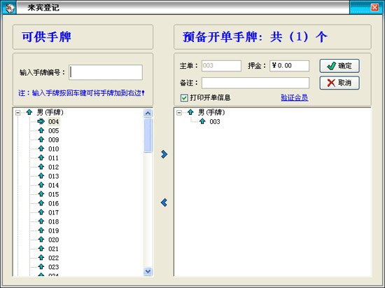 | 手牌:手牌可分為男賓手牌和女賓手牌,每個(gè)手牌就具體到某一來店登記的賓客,一般把手牌提供給一個(gè)客人后,在當(dāng)前客人未退出占用狀態(tài)前暫時(shí)無法提供給另一個(gè)客人消費(fèi)。此項(xiàng)目在系統(tǒng)設(shè)置中設(shè)置,在賓客開單時(shí)使用。