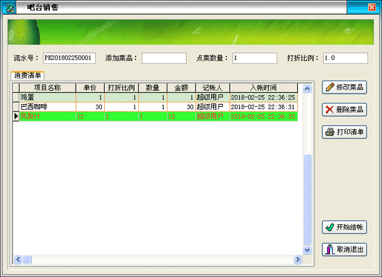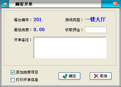 | 點(diǎn)單消費(fèi)→增加消費(fèi):客人在消費(fèi)過(guò)程中所消費(fèi)的所有項(xiàng)目均要進(jìn)行入帳處理,以便在客人離店時(shí)自動(dòng)計(jì)算消費(fèi)額。客人的消費(fèi)明細(xì)便是在此入帳。 | |||