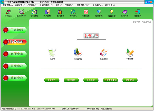 | 3、日常操作:主要包括現(xiàn)金支出、單項(xiàng)收入、日財(cái)務(wù)表、商品入庫、員工獎(jiǎng)懲、客戶調(diào)查、客戶生日等內(nèi)容。 | |||