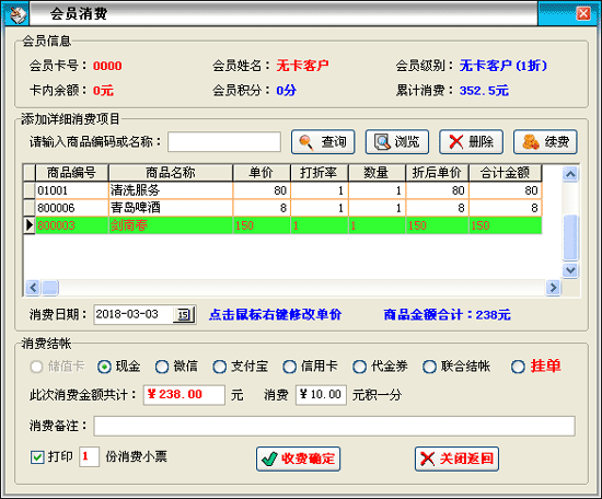 會員消費(fèi):對會員消費(fèi)情況進(jìn)行錄入,自動完成累計(jì)積分,消費(fèi)打折。也可以增加會員消費(fèi)商品的詳細(xì)信息。