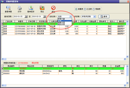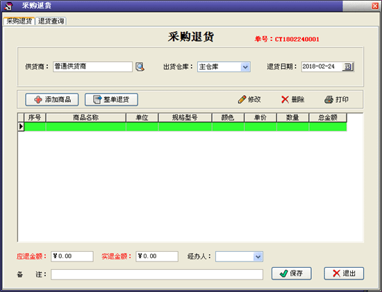 | 進(jìn)貨管理:進(jìn)行商品采購(gòu)入庫(kù),采購(gòu)?fù)素?進(jìn)/退單據(jù)和當(dāng)前庫(kù)存查詢(xún),與供貨商的往來(lái)帳務(wù)。 | |||