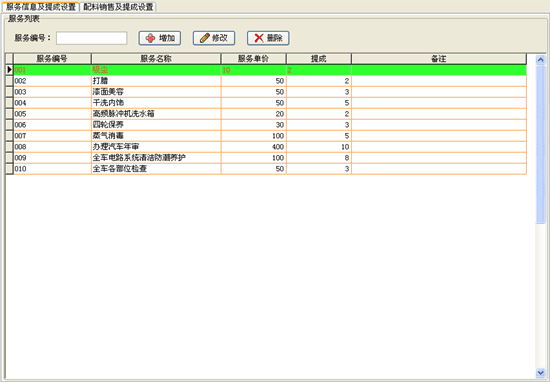 | 維修設(shè)置:包括服務(wù)項(xiàng)目的添加、提成設(shè)置;配件銷售的提成設(shè)置等。 |